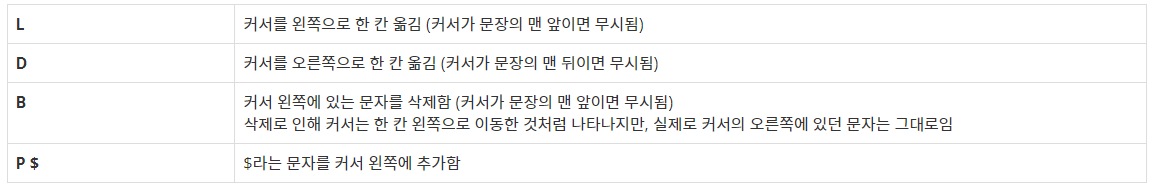 저는 초기 편집기에 입력되어 있는 문자열을 list에 넣고 list의 사이즈를 index로 해당 커서의 위치를 변경해주면서 명령어를 수행해주었습니다. 하지만 채점 결과 시간 초과가 발생했고 이 문제를 해결하기 위해 질문게시판과 블로그를 찾아봤습니다.