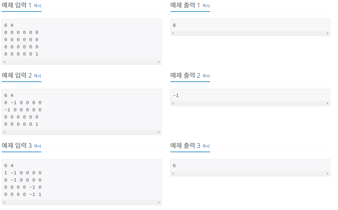 여러분은 토마토가 모두 익을 때까지의 최소 날짜를 출력해야 한다. 만약, 저장될 때부터 모든 토마토가 익어있는 상태이면 0을 출력해야 하고, 토마토가 모두 익지는 못하는 상황이면 -1을 출력해야 한다.