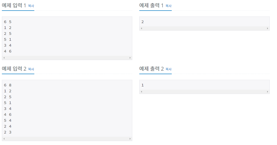 방향 없는 그래프가 주어졌을 때, 연결 요소 (Connected Component)의 개수를 구하는 프로그램을 작성하시오.