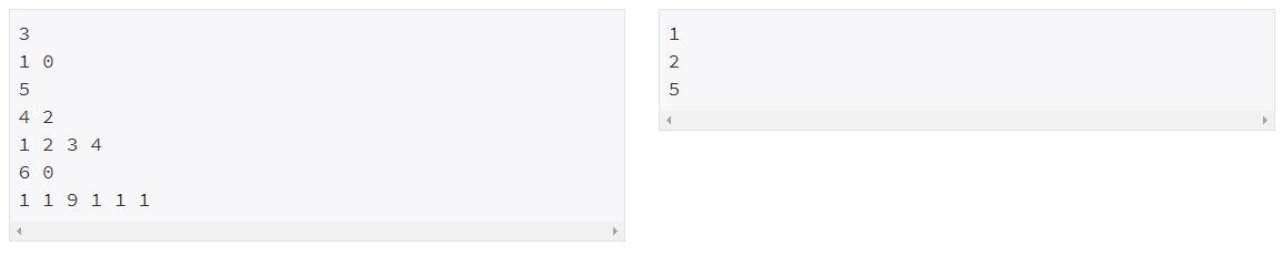 테스트 케이스의 첫 번째 줄에는 문서의 개수 N(1 ≤ N ≤ 100)과, 몇 번째로 인쇄되었는지 궁금한 문서가 현재 Queue에서 몇 번째에 놓여 있는지를 나타내는 정수 M(0 ≤ M < N)이 주어진다. 이때 맨 왼쪽은 0번째라고 하자. 두 번째 줄에는 N개 문서의 중요도가 차례대로 주어진다. 중요도는 1 이상 9 이하의 정수이고, 중요도가 같은 문서가 여러 개 있을 수도 있다.