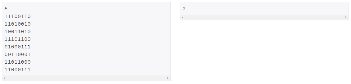 첫 줄에는 한 줄에 들어가는 방의 수 n(1≤n≤50)이 주어지고, 다음 n개의 줄의 각 줄마다 0과 1이 이루어진 길이가 n인 수열이 주어진다. 0은 검은 방, 1은 흰 방을 나타낸다.