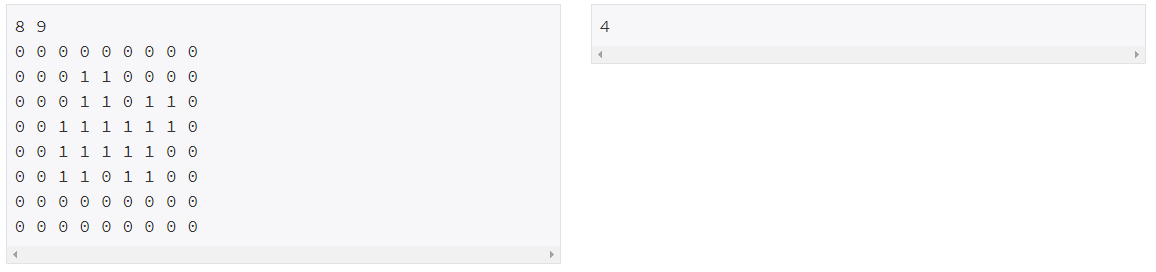 첫째 줄에는 모눈종이의 크기를 나타내는 두 개의 정수 N, M (5≤N, M≤100)이 주어진다. 그 다음 N개의 줄에는 모눈종이 위의 격자에 치즈가 있는 부분은 1로 표시되고, 치즈가 없는 부분은 0으로 표시된다. 또한, 각 0과 1은 하나의 공백으로 분리되어 있다.