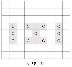 <그림 2>와 같이 치즈 내부에 있는 공간은 치즈 외부 공기와 접촉하지 않는 것으로 가정한다. 그러므 로 이 공간에 접촉한 치즈 격자는 녹지 않고 C로 표시된 치즈 격자만 사라진다. 그러나 한 시간 후, 이 공간으로 외부 공기가 유입되면 <그림 3>에서와 같이 C로 표시된 치즈 격자들이 사라지게 된다.