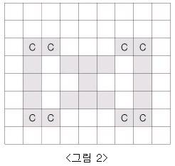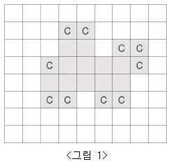 N×M (5≤N, M≤100)의 모눈종이 위에 아주 얇은 치즈가 <그림 1>과 같이 표시되어 있다. 단, N 은 세로 격자의 수이고, M 은 가로 격자의 수이다. 이 치즈는 냉동 보관을 해야만 하는데 실내온도에 내어놓으면 공기와 접촉하여 천천히 녹는다. 그런데 이러한 모눈종이 모양의 치즈에서 각 치즈 격자(작 은 정사각형 모양)의 4변 중에서 적어도 2변 이상이 실내온도의 공기와 접촉한 것은 정확히 한 시간 만에 녹아 없어져 버린다. 따라서 아래 <그림 1> 모양과 같은 치즈(회색으로 표시된 부분)라면 C로 표시된 모든 치즈 격자는 한 시간 후에 사라진다.