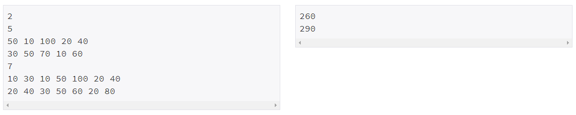 첫째 줄에 테스트 케이스의 개수 T가 주어진다. 각 테스트 케이스의 첫째 줄에는 n (1 ≤ n ≤ 100,000)이 주어진다. 다음 두 줄에는 n개의 정수가 주어지며, 각 정수는 그 위치에 해당하는 스티커의 점수이다. 연속하는 두 정수 사이에는 빈 칸이 하나 있다. 점수는 0보다 크거나 같고, 100보다 작거나 같은 정수이다.