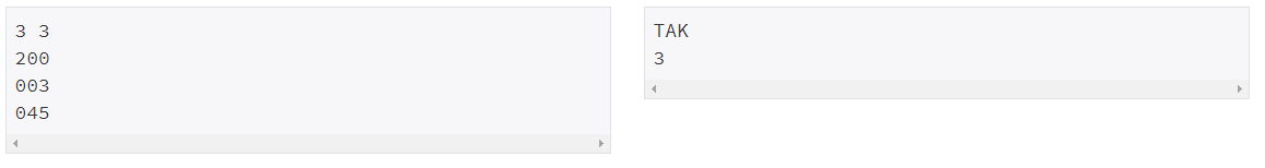 첫째 줄에 "TAK"(폴란드어로 YES를 의미)을 출력하고, 둘째 줄에 현위치에서 가장 빨리 도착할 수 있는 음식까지의 최단 거리를 출력한다.