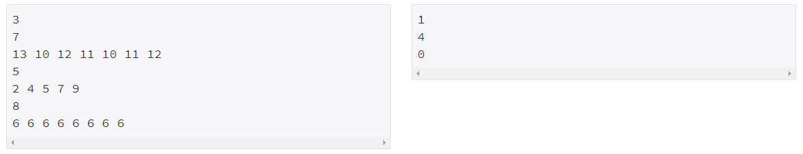 이어지는 각 줄마다 첫 줄에 통나무의 개수를 나타내는 정수 N(5 ≤ N ≤ 10,000), 둘째 줄에 각 통나무의 높이를 나타내는 정수 Li가 주어진다. (1 ≤ Li ≤ 100,000)