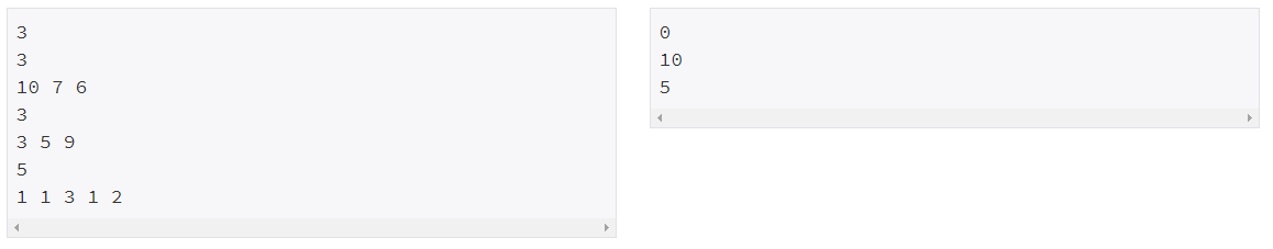 입력의 첫 줄에는 테스트케이스 수를 나타내는 자연수 T가 주어진다. 각 테스트케이스 별로 첫 줄에는 날의 수를 나타내는 자연수 N(2 ≤ N ≤ 1,000,000)이 주어지고, 둘째 줄에는 날 별 주가를 나타내는 N개의 자연수들이 공백으로 구분되어 순서대로 주어진다. 날 별 주가는 10,000이하다.
