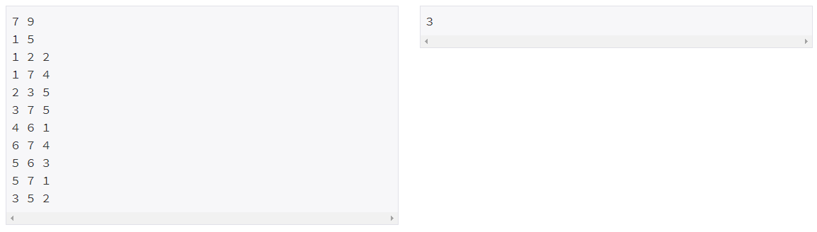 첫 번째 줄에는 섬에 존재하는 집의 수 N(2≤N≤100,000)와 다리의 수 M(1≤M≤300,000)이 주어진다. 두 번째 줄에는 숭이의 출발 위치(s)와 혜빈이의 위치(e)가 주어진다. (1≤s, e≤N, s≠e). 다음 M개의 줄에는 다리의 정보가 주어진다. 각 줄은 “집의 번호 h1(1≤h1≤N), 집의 번호 h2(1≤h2≤N), 다리의 무게제한 k(1≤k≤1,000,000)” 형식으로 주어진다. (h1집과 h2집은 무게제한이 k인 다리로 연결되어 있다.)
