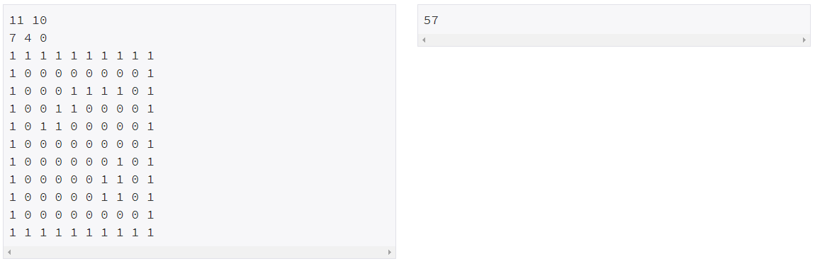 셋째 줄부터 N개의 줄에 장소의 상태가 북쪽부터 남쪽 순서대로, 각 줄은 서쪽부터 동쪽 순서대로 주어진다. 빈 칸은 0, 벽은 1로 주어진다. 지도의 첫 행, 마지막 행, 첫 열, 마지막 열에 있는 모든 칸은 벽이다.