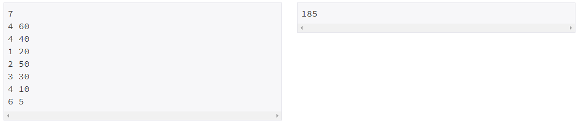 다음 줄부터 N개의 줄에는 각각 두 정수 d (1 ≤ d ≤ 1,000)와 w (1 ≤ w ≤ 100)가 주어진다. d는 과제 마감일까지 남은 일수를 의미하며, w는 과제의 점수를 의미한다.